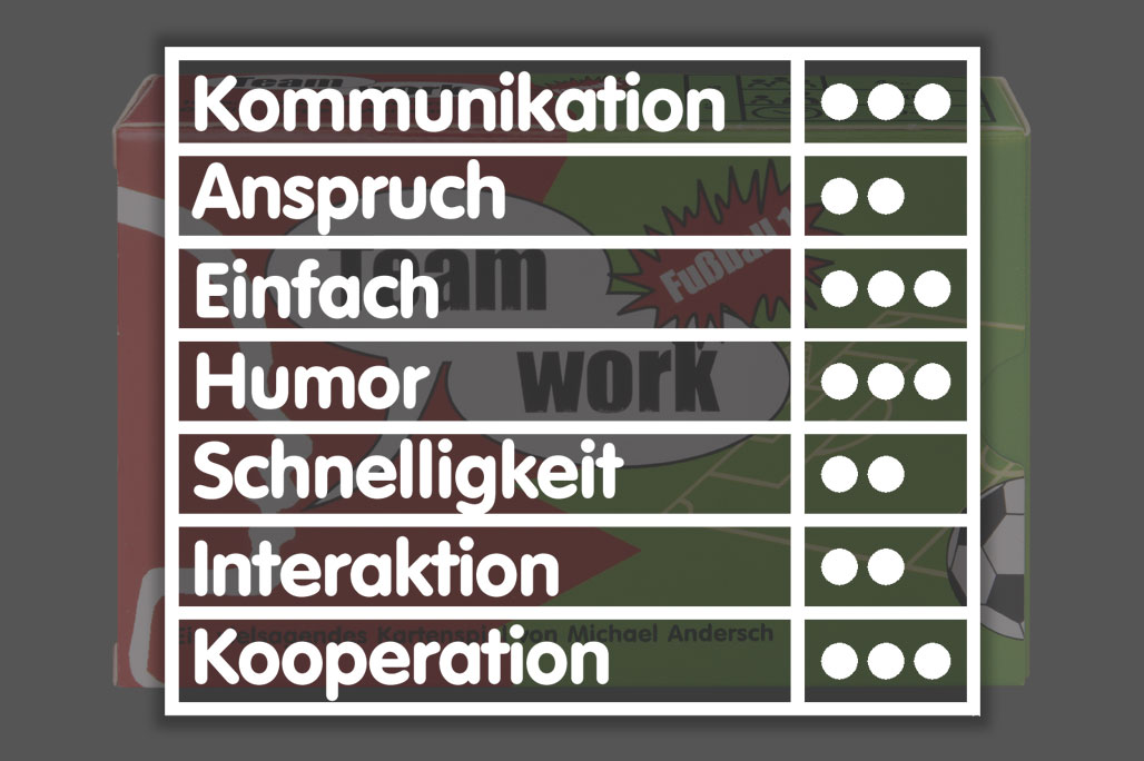 Nach dem großen Erfolg des Spieles TEAMWORK „Original“ wird es ständig weitere Themenbereiche mit speziellen Begriffen geben. Alle Karten aus den unterschiedlichen TEAMWORK Themenbereichen können zusammengemischt werden, um so einen größeren Fundus an Begriffen zu erhalten.